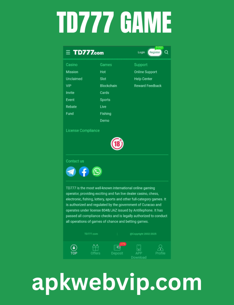 TD777 Game is a real money app it gives opportunity to seventeen plus games at one APK. All game made are casino based games with advance features and chance big reward win system. This platform is Financial Based and Made for online money earning. Many people in Pakistan use it daily because User earn both money through earning opportunities and without investment tasks. It is partner of G555Game and Same like x11 and Work likeBV999 The app clam that , it operates under license which is approved by authorized government Curacao. Eligibility criteria under 18 years and every user to be followed rules must under license 8048 before play.