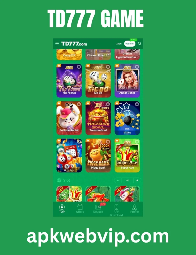 TD777 Game is a real money app designed for online game activity It works as like real casino game with advance features and lot of earning opportunities. the APK file gives multiple game option with full category games. Slot, poker, poker cards, Sports, Fishing, live, blockchain and other modes are included. Users can select Demo option to understand teach game roles. Learning wins the bet and develops game skills support improving game Vallet.
